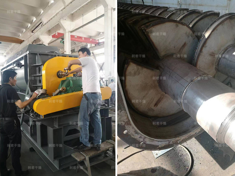 空心軸上密集排列著楔型中空漿葉,熱介質(zhì)經(jīng)空心軸流經(jīng)漿葉。單位有效容積內(nèi)傳熱面積很大,熱介質(zhì)溫度從-40℃到320℃,可以是水蒸汽,也可以是液體型:如熱水、導(dǎo)熱油等。間接傳導(dǎo)加熱,沒有攜帶空氣帶走熱量,熱量均用來(lái)加熱物料。熱量損失僅為通過器體保溫層向環(huán)境的散熱。楔型漿葉傳熱面具有自清潔功能。物料顆粒與楔型面的相對(duì)運(yùn)動(dòng)產(chǎn)生洗刷作用,能夠洗刷掉楔型面上附著物料,使運(yùn)轉(zhuǎn)中一直保持著清潔的傳熱面。漿葉干燥機(jī)的殼體為Ω型,殼體內(nèi)一般安排二到四根空心攪拌軸。殼體有密封端蓋與上蓋,防止物料粉塵外泄而充分發(fā)揮作用。