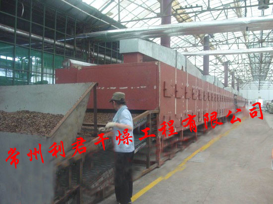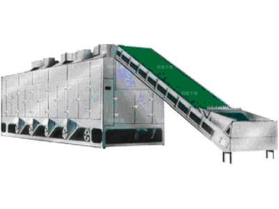 物料由加料器均勻地鋪在網(wǎng)帶上,網(wǎng)帶一般采用12-60目不銹鋼絲網(wǎng),由傳動裝置拖動在干燥機內(nèi)移動。干燥機由若干單元組成,每一單元熱風(fēng)獨立循環(huán),部分尾氣由專門排濕風(fēng)機排出,廢氣由調(diào)節(jié)閥控制,熱氣由下往上或由上往下穿過鋪滿物料的網(wǎng)帶完成熱量與質(zhì)量傳遞的進程,帶走物料水份。網(wǎng)帶緩慢移動,運行速度可根據(jù)物料溫度自由調(diào)節(jié),干燥后的成品連續(xù)落入收料器中。上下循環(huán)單元根據(jù)用戶需要可靈活配備,單元數(shù)量亦可根據(jù)需要選取。