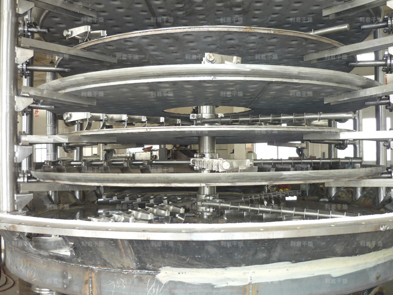 濕物料自加料器連續(xù)地加到干燥器上部第一層干燥盤上,帶有耙葉的耙臂作回轉(zhuǎn)運動使耙臂作回轉(zhuǎn)運動使耙葉連續(xù)地翻抄物料。物料沿指數(shù)螺旋線流過干燥盤表面,在小干燥盤上的物料被移送到外緣,并在外緣落到下方的大干燥盤外緣,在大干盤上物料向里移動并從中間落料口落如下一層小干燥盤中。大小干燥盤上下交替排列,物料得以連續(xù)地流過整個干燥器。中空的干燥盤內(nèi)通入加熱介質(zhì),加熱介質(zhì)形式有飽和蒸汽、熱水和導(dǎo)熱油,加熱介質(zhì)由干燥盤的一端進(jìn)入,從另一端導(dǎo)出。已干物料從最后一層干燥盤落到殼體的底層,最后被耙葉移送到出料口排出。濕份從物料中逸出,由設(shè)在頂蓋上的排濕口排出,真空型盤式干燥器的濕氣由設(shè)在頂蓋上的真空泵口排出。從底層排出的干物料可直接包裝。通過配加翅片加熱器、溶劑回收冷凝器、袋式除塵器、干料返混機(jī)構(gòu)、引風(fēng)機(jī)等輔機(jī),可提高其干燥的生產(chǎn)能力,干燥膏糊狀和熱敏性物 料,可方便地回收溶劑,并能進(jìn)行熱解和反應(yīng)操作。
