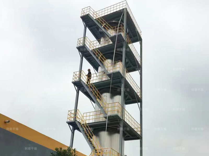本機(jī)組工作過(guò)程為料液通過(guò)隔膜泵高壓輸入,噴出霧狀液滴,然后同熱空氣并流下降,大部分粉粒由塔底排料口收集,廢氣及其微小粉末經(jīng)旋風(fēng)分離器分離,廢氣由抽風(fēng)機(jī)排出,粉末由設(shè)在旋風(fēng)分離器下端的授粉筒收集,風(fēng)機(jī)出口還可裝備二級(jí)除塵裝置,回收率在96-98%以上。